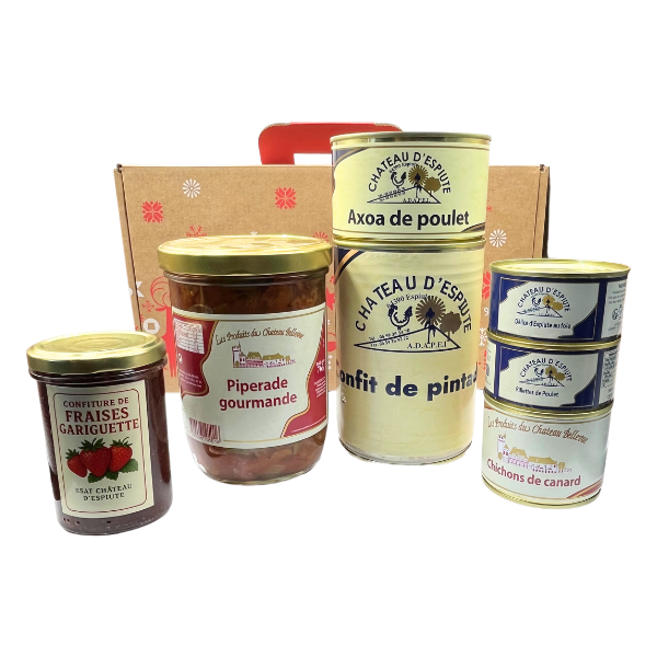 Confit de pintade (900g) Délice d’Espiute au foie (130g) Rillettes de poulet (130g) Axoa de poulet (380g) Confiture de fraises gariguettes (250g) Piperade gourmande (765g) Chichons de canard (190g)